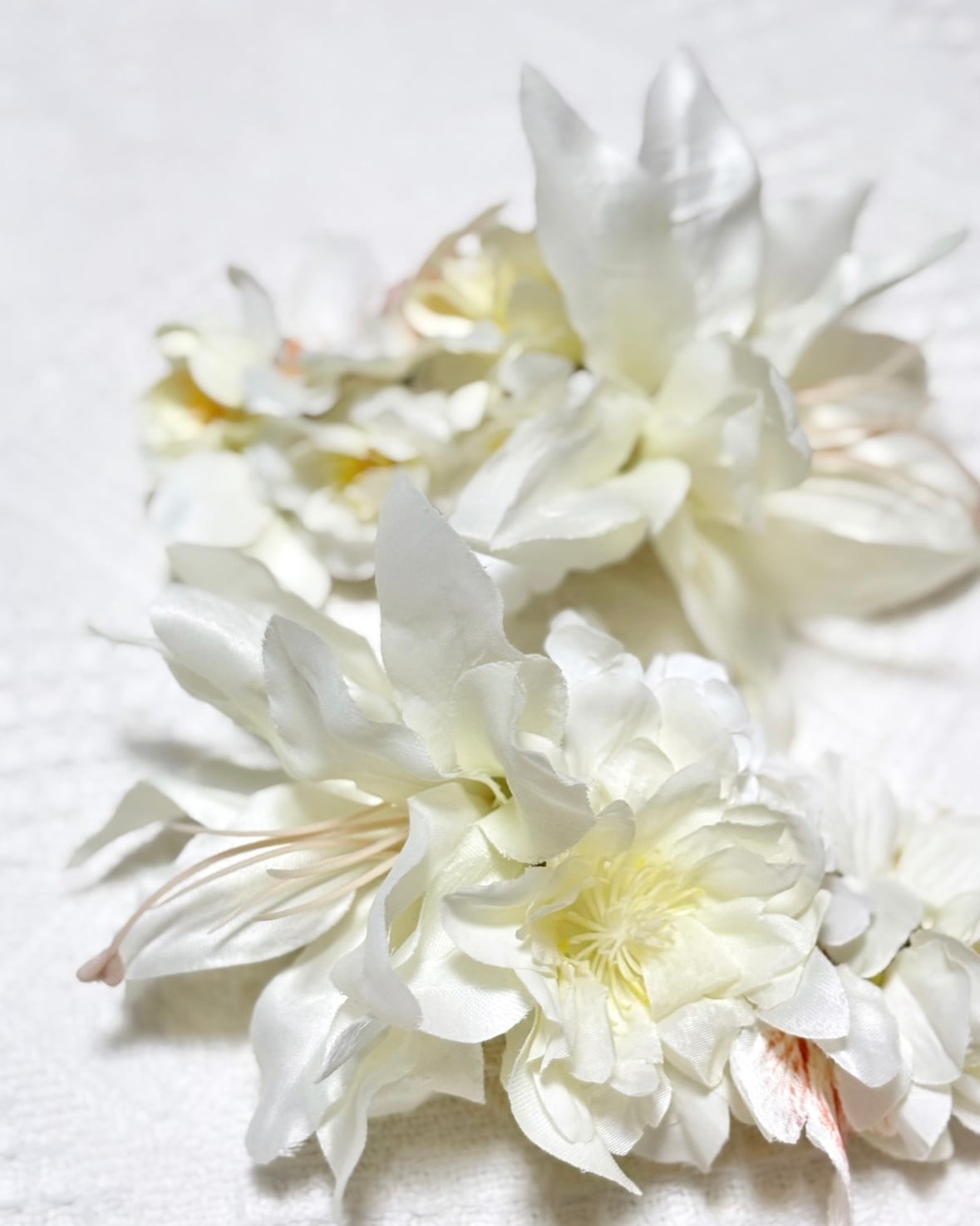 白い大きな百合をベースに椿や蘭が咲き誇り、お子様から大人の方までご着用頂けるとっておきのヘアクリップです。